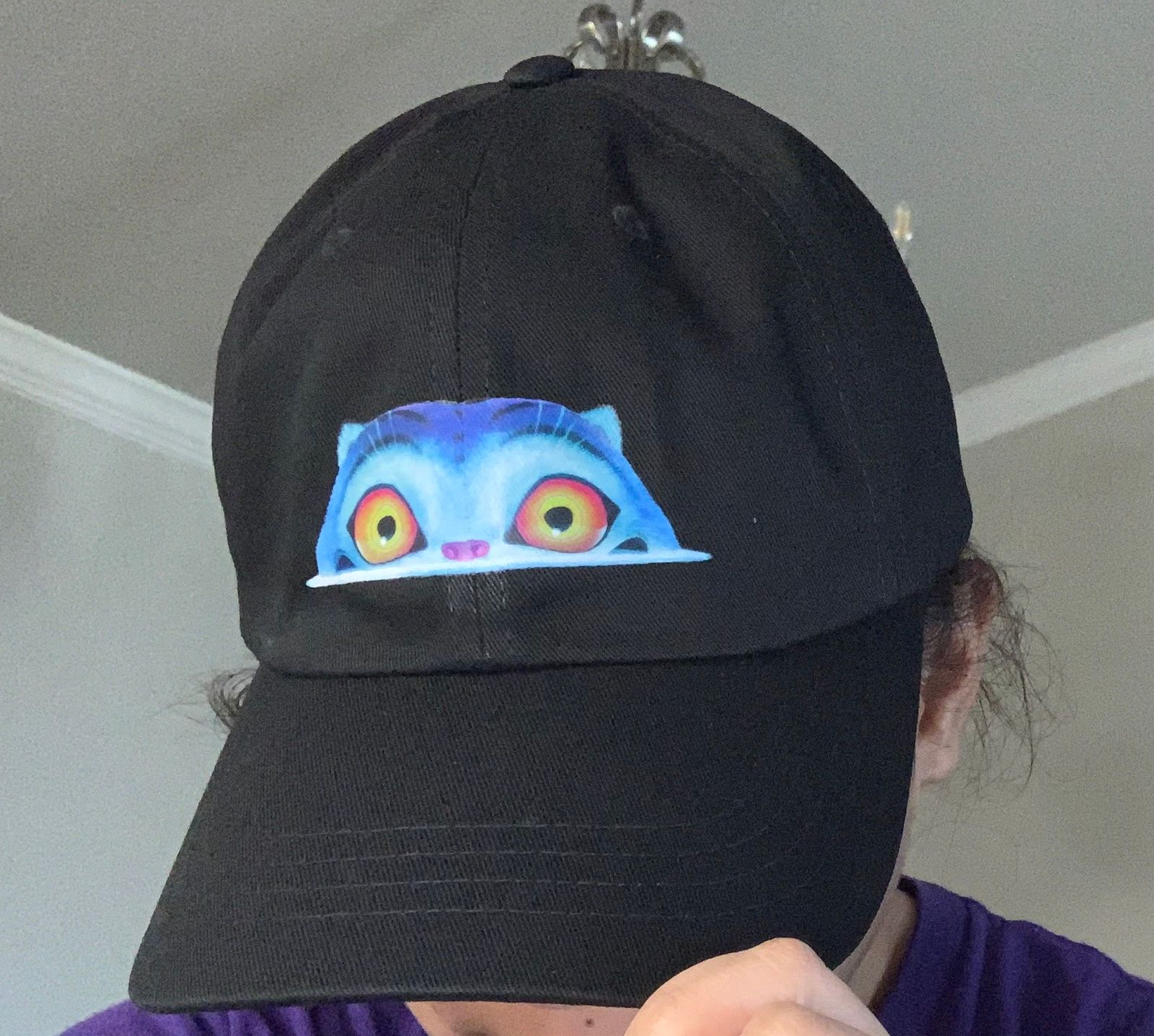Hat fabric is lovely, rich black, soft, and adjustable, and design is bright, crisp, and well-applied!
