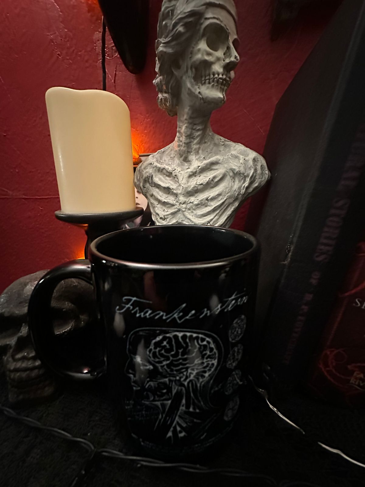 Behold the vessel of your awakening. This Frankenstein mug, cast in a deep black colour, features the intricate anatomy drawing of my greatest creation. Sip your dark tea and feel the spark of life surge through you. It is alive, meticulously crafted for those who dare to play with the mysteries of science.